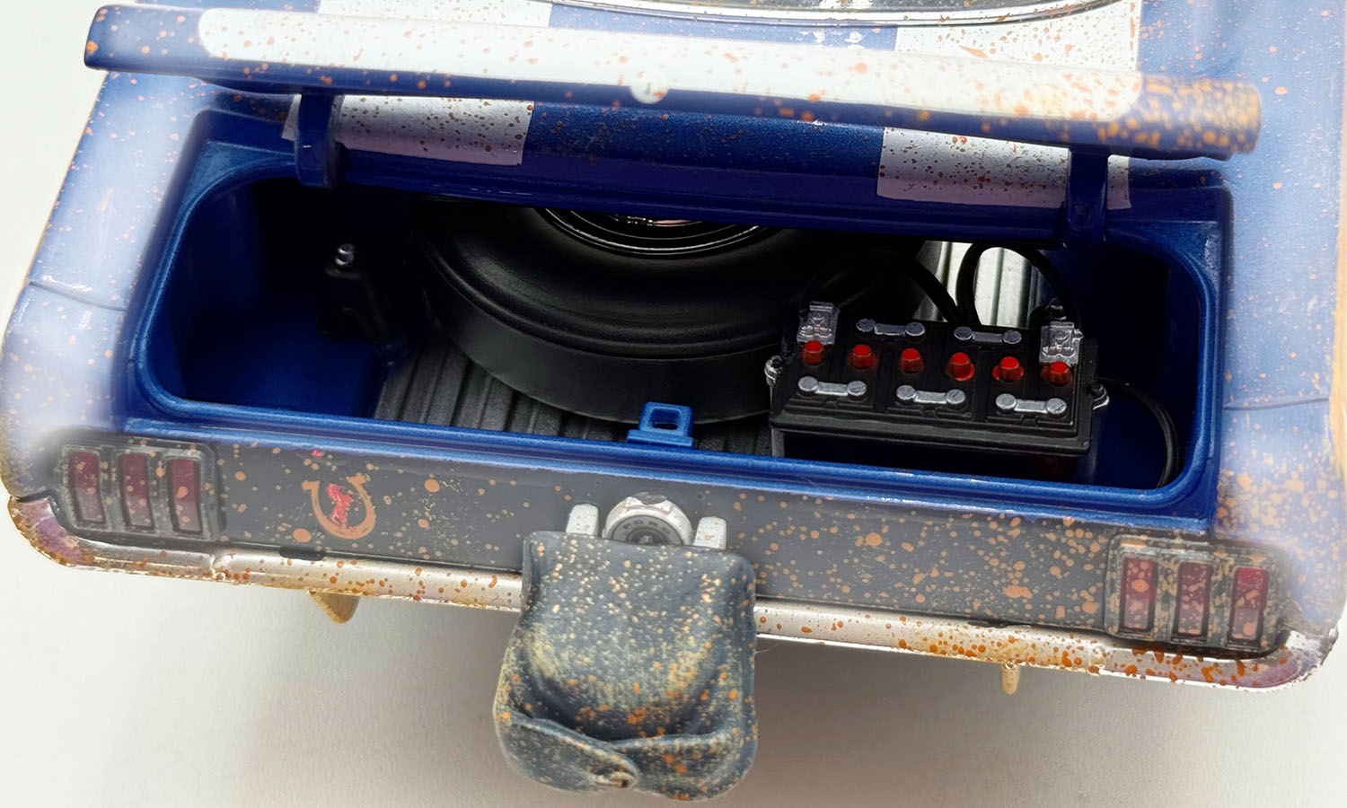 At first glance, it may not look all that different from any other run-of-the-mill first-generation Mustang. On closer examination, however, the velocity stacks provide the hint that something special lurks underneath. The A/FX Mustangs all used Ford 427 cubic-inch engines, five of which were the SOHC (single overhead cam) version of that power plant. Engine bays were modified to position the engine further back in the chassis. The Southern Speed & Marine '65 Ford Mustang A/FX Colt .45 features a weathered barn find appearance, sporting the COLT .45 door logos and horseshoe on each front fender. Open the doors and you'll discover the fully detailed race interior with a 4-speed manual transmission and dash mounted tachometer. Detailed undercarriage, lift off hood, and so much more!