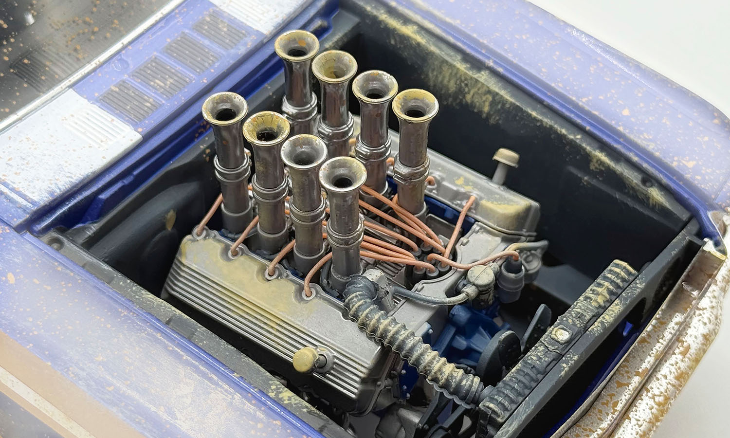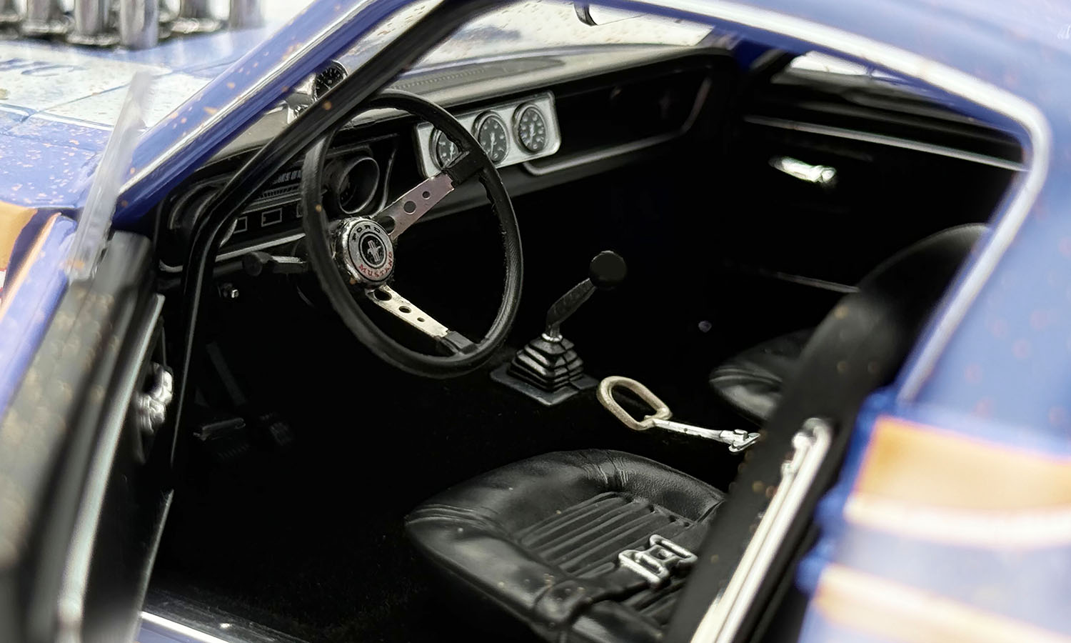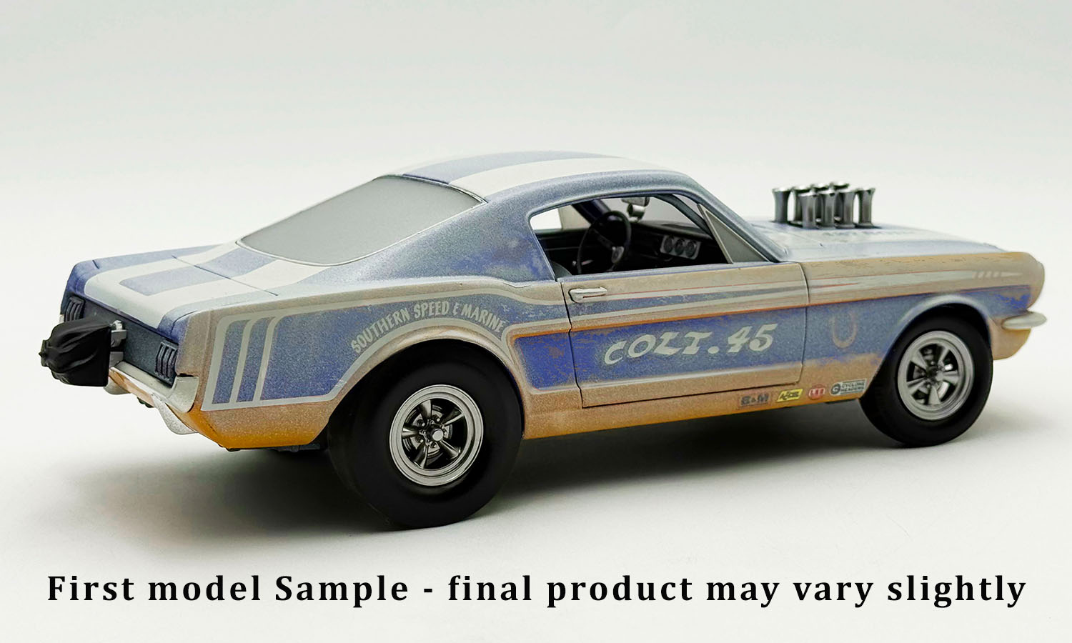 At first glance, it may not look all that different from any other run-of-the-mill first-generation Mustang. On closer examination, however, the velocity stacks provide the hint that something special lurks underneath. The A/FX Mustangs all used Ford 427 cubic-inch engines, five of which were the SOHC (single overhead cam) version of that power plant. Engine bays were modified to position the engine further back in the chassis. The Southern Speed & Marine '65 Ford Mustang A/FX Colt .45 features a weathered barn find appearance, sporting the COLT .45 door logos and horseshoe on each front fender. Open the doors and you'll discover the fully detailed race interior with a 4-speed manual transmission and dash mounted tachometer. Detailed undercarriage, lift off hood, and so much more!