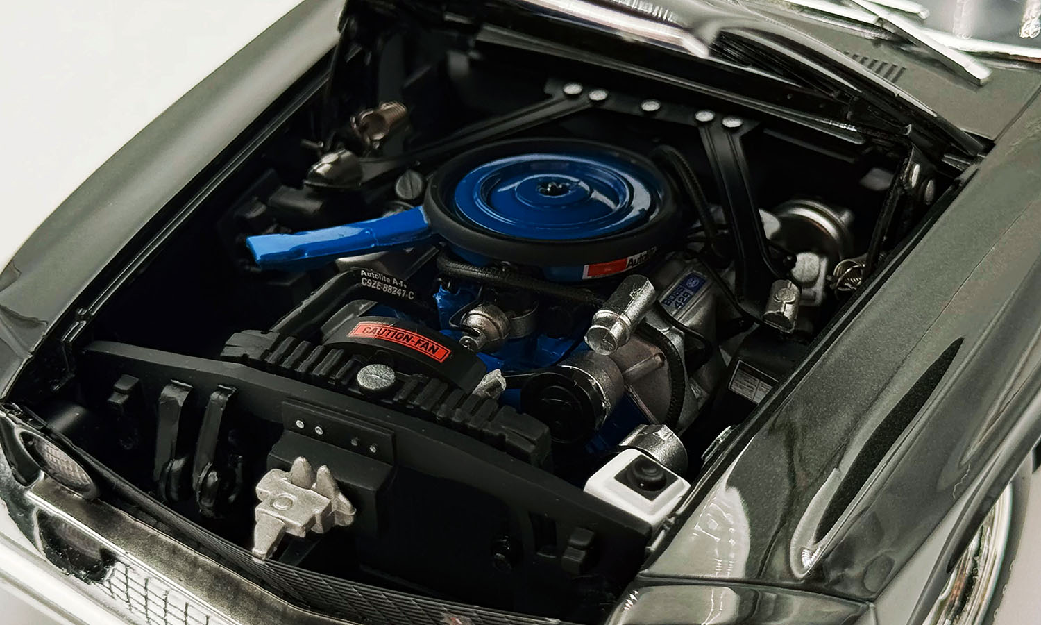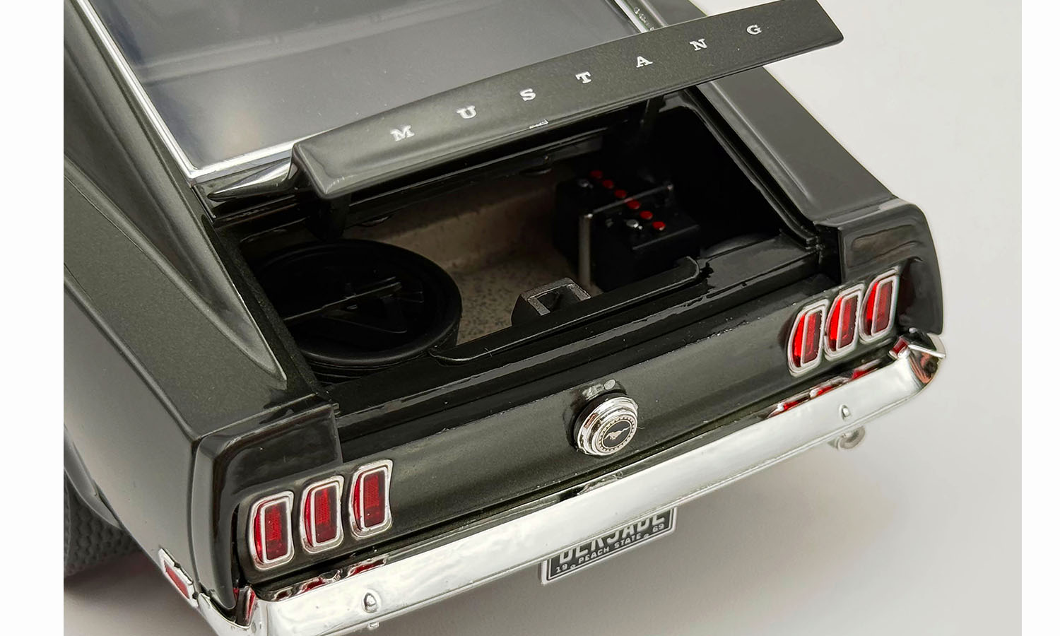 This is a rare automobile, one of just 850 units produced for the model year, and one of 162 painted Black Jade, which is one of those fascinating colorways that plays tricks on the eye. Even though it’s called “Black”, this is more of a dark green metallic with a hint of black. In the shade, the car looks nearly black, but under direct sunlight the metallic flakes shine through making the car look somewhat like a deep forest or mossy green. This is one of the rarest and most unique Mustang colors of the late 60s, which makes it perfect for something like the Boss 429.