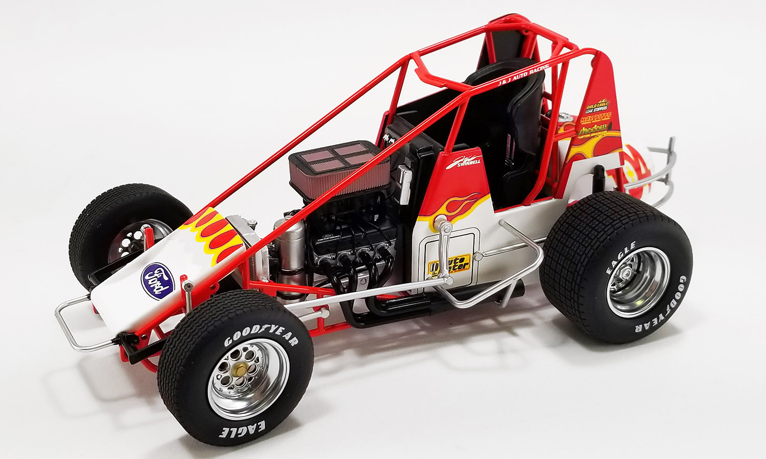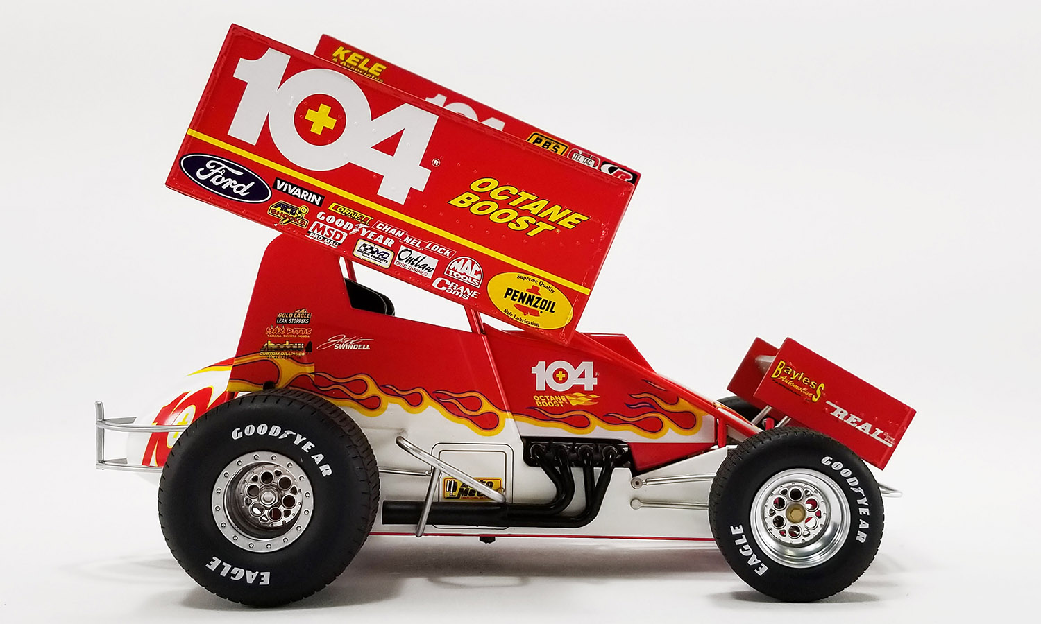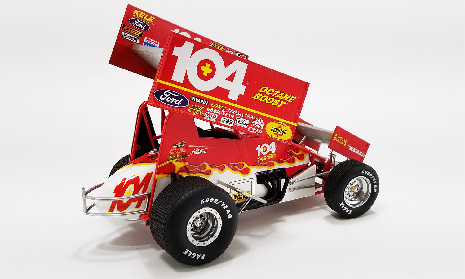 In 2020, Jeff Swindell was inducted into the National Sprint Car Hall of Fame. His legendary career spans nearly five decades earning 51 World of Outlaws feature victories. In the 1998 World of Outlaws season, Jeff Swindell campaigned the #104 Octane Boost Sprint Car. This car became one of his most recognizable rides, standing out with its vivid graphics and aggressive stance.