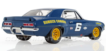 The 1969 season was filled with accusations of cheating on behalf of the Sunoco team and many involved the vinyl top 6 and 9 Camaros. Accusations were made that the Camaros had been left in the acid dipping solution to long. It was alleged that the vinyl tops were placed on the cars to cover up the damage. After the removal of the tops, the Sunoco Camaros, were arguably the most beautiful cars in the series. Piloted by Mark Donohue, Ronnie Bucknum and Ed Leslie, these cars and their drivers stole the headlines and brought out record crowds that created new enthusiasm for the series. Now you can own this beautiful replica of the ‘69 Sunoco Camaro which features opening doors, trunk, hood, working steering and much more. Order yours today!